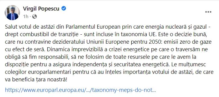 Ministrul Energiei, Virgil Popescu, și-a exprimat și el punctul de vedere favorabil referitor la votul din PE, într-un mesaj postat pe contul său de Facebook. „Este o decizie bună, care nu contravine dezideratului Uniunii Europene pentru 2050: emisii zero de gaze cu efect de seră. Dinamica imprevizibilă a crizei energetice pe care o traversăm ne obligă să fim responsabili, să ne folosim de toate resursele pe care le avem la dispoziţie pentru a asigura independenţa şi securitatea energetică. Le mulţumesc colegilor europarlamentari pentru că au înţeles importanţa votului de astăzi, de care va beneficia ţara noastră”, a afirmat Virgil Popescu, în mesajul citat.