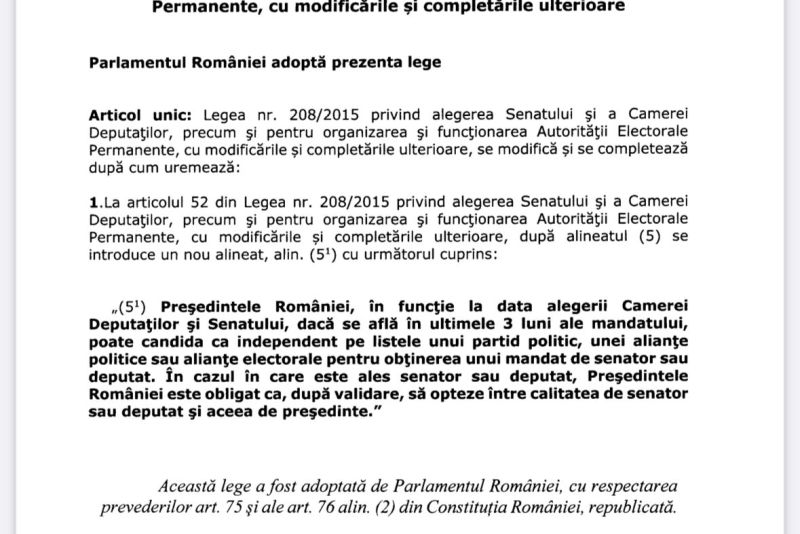 PNL a înregistrat în procedură legislativă o modificare a legii care prevede că Președintele în funcție, aflat în ultimele 3 luni de mandat, poate candida ca independent pe lista unui partid sau a unei alianțe. Documentul a fost prezentat de Realitatea Plus.