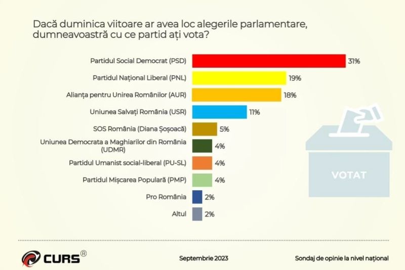 Un sondaj de opinie CURS arată că dacă duminica viitoare ar avea loc alegerile parlamentare, clasamentul partidelor ar fi următorul: PSD -13%, PNL - 19%, AUR - 18%, USR - 11%.