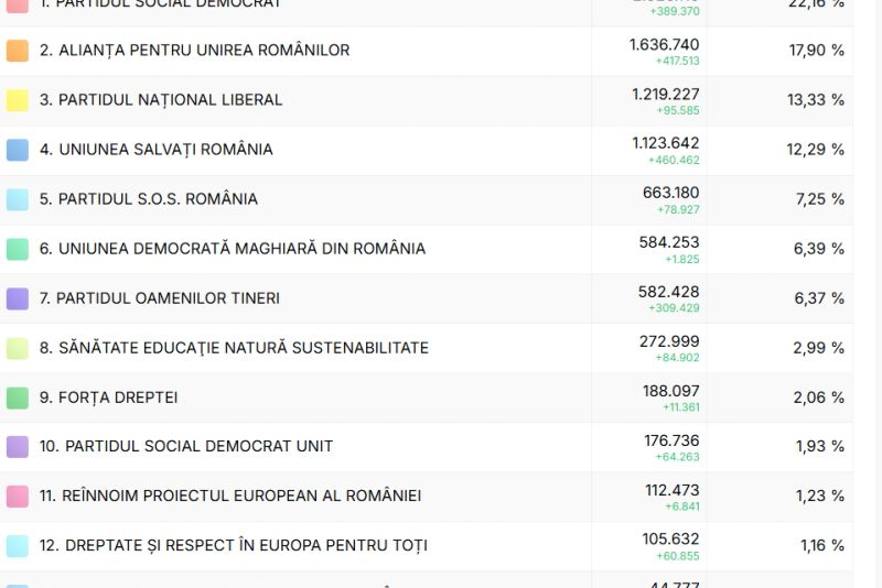 Biroul Electoral Central a numărat voturile din peste 99% dintre secții. Conform datelor de până la această oră, șapte partide vor avea reprezentanți în Senat și Camera Deputaților în viitorul mandat. În prezent, ordinea partidelor după alegerile parlamentare este PSD, AUR, PNL, USR. Este însă puțin probabil să apară schimbări având în vedere că numărătoarea voturilor la alegerile parlamentare 2024 este aproape finalizată.