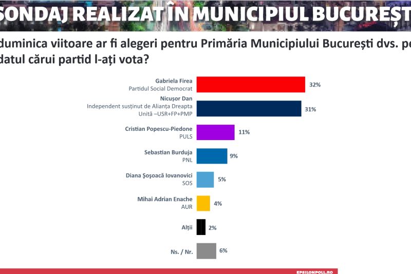 Un nou sondaj efectuat în București arată că Gabriela Firea este în fruntea preferințelor electorale, devansându-l pe actualul primar, Nicușor Dan. Conform rezultatelor obținute dintr-un eșantion de 5.430 de respondenți activi online, Firea a obținut 32% din preferințele acestora, în timp ce Dan se află foarte aproape, cu 31%. Cristian Popescu Piedone a înregistrat un procent de doar 11%, semnificativ mai mic decât principalii doi candidați.