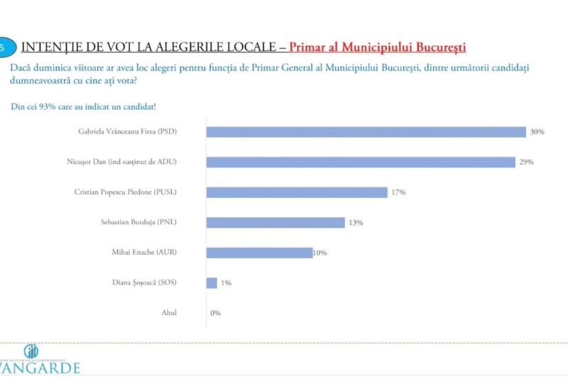 Potrivit sondajului AVANGARDE, dacă duminica viitoare ar avea loc alegeri, Gabriela Firea ar obține 30%, Nicușor Dan 29%, Cristian Popescu Piedone 17%, Sebastian Burduja (PNL) 13%, Mihai Enache (AUR) 10% și Diana Șoșoacă (SOS) 1%.