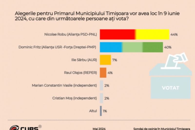 Potrivit sondajului CURS, Nicolae Robu, candidatul susținut de PSD și PNL, ar obține 44%, în timp ce Dominic Fritz, candidatul susținut de USR-Forța Dreptei și PMP ar obține 40%.