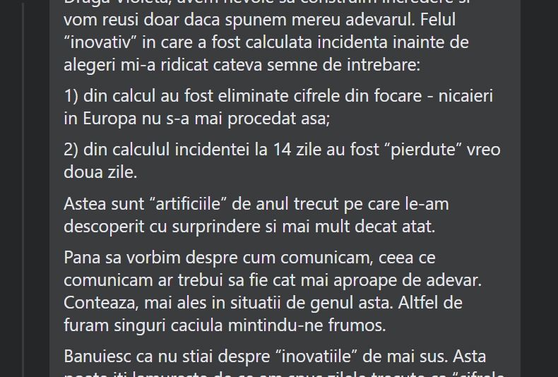 "Draga Violeta, avem nevoie sa construim incredere si vom reusi doar daca spunem mereu adevarul", a scris Voiculescu."Felul “inovativ” in care a fost calculata incidenta inainte de alegeri mi-a ridicat cateva semne de intrebare:1) din calcul au fost eliminate cifrele din focare - nicaieri in Europa nu s-a mai procedat asa;2) din calculul incidentei la 14 zile au fost “pierdute” vreo doua zile.Astea sunt “artificiile” de anul trecut pe care le-am descoperit cu surprindere si mai mult decat atat.